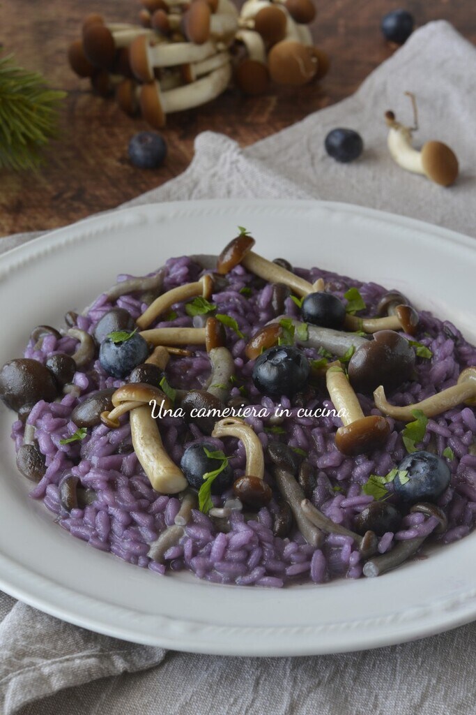 The risotto with mushrooms and blueberries is a delicious fall/winter risotto, with an unusual and delightful combination. I first tasted this risotto in a pub, and after many years, I decided to cook and offer it to you. I always use Carnaroli rice for risotto, the best for these dishes. The recipe also includes fresh pioppini mushrooms, first boiled to make them more tender, and fresh blueberries that give a beautiful purple color to the risotto. Two ingredients in perfect flavor contrast, from the delicate forest scent of the mushrooms to the slightly tangy note of the blueberries.