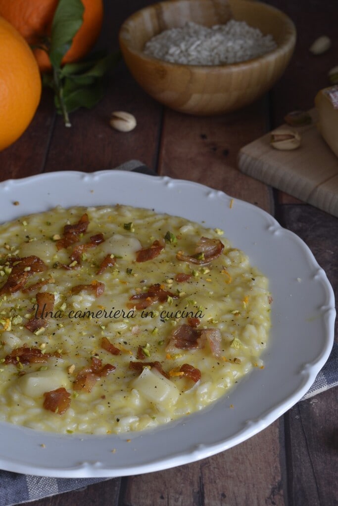 Risotto with Taleggio, Orange, and Bacon is a main course prepared with simple ingredients that make it both delicious and refined. After preparing the classic base of sautéed onions and toasted rice, the rice is cooked by adding orange juice that colors and perfumes it, with taleggio cheese adding creaminess alongside the crunchy notes of bacon and pistachio crumbs. A perfect dish for special occasions, holidays, or when you want to savor a risotto that’s different from the usual.