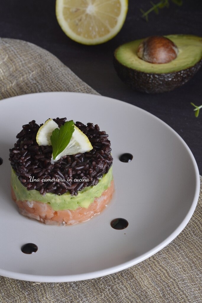 The salmon tartare with avocado and black rice is a tasty and simple appetizer to serve year-round, especially on special occasions or when you’re in the mood for something different as a starter, or by increasing the portions, it’s also a delightful main course. For the recipe, I was inspired by the classic tartares found in sushi restaurants in Italy, although it’s a “fusion” (fusion or contemporary cuisine) of different cultures, from avocado, an exotic fruit that’s become very trendy in recent years, to raw fish, in this case, as per Japanese culture, and finally to rice, of the black variety, with elongated grains, very aromatic.