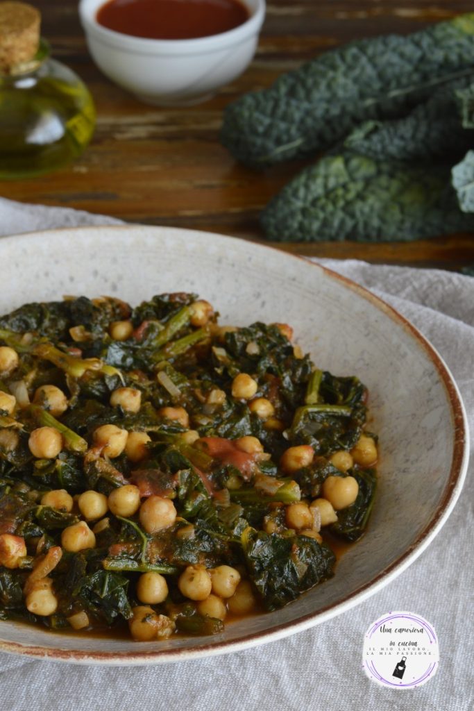 The stewed Tuscan kale with chickpeas is a simple and tasty dish. This particular type of kale, dark green in color, is seasonal, characterized by long, curly, and blistered leaves. It is widely used in Tuscan cuisine, especially in first courses. In this case, it is also an excellent complete vegan main course.