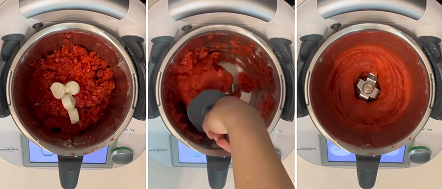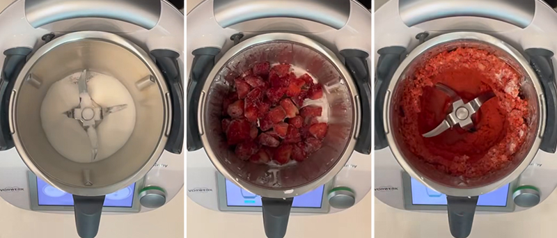 Add the frozen strawberries and blend for 15 seconds at speed 7, then bring it to the bottom with the spatula.