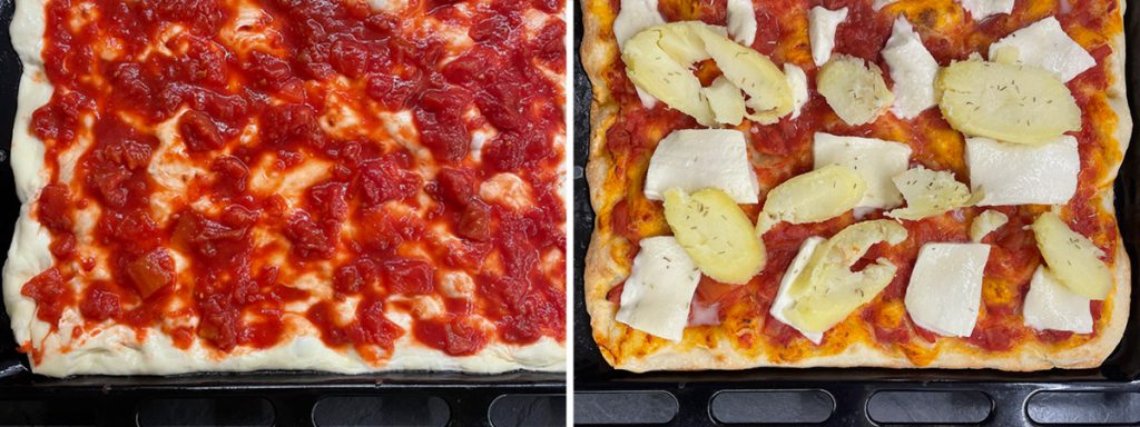 Pizza with porchetta, potatoes, and buffalo mozzarella, a very tasty tray pizza with a combination of flavors that I really like. This is the basic dough that I use for tray pizzas, simple to work with and that won’t give you problems even in rolling it out.