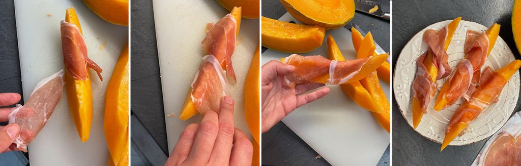 As for the melon to use, it must be ripe at the right point, fragrant, and with a slightly yielding end when touched. The variety I prefer to eat this way is the netted melon or cantaloupe; to clarify, it is the one with orange flesh.