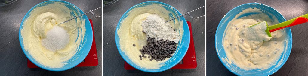 • Place the ricotta in a bowl, add a pinch of salt and the egg. Mix with a whisk to blend everything, then add the sugar, chocolate chips, and flour. Also add the lemon juice and mix everything well until you get a smooth cream.