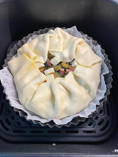 • Trim the excess parchment paper and place the pie in the air fryer. Cook for 25-30 minutes at 320°F, then check the cooking. Once it’s golden, remove it from the fryer and let it rest for a few minutes before serving.
