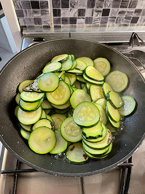 • Slice the zucchini thinly (I used the mandoline) and cook them in a pan with a drizzle of olive oil and a pinch of chopped parsley for about 5 minutes, stirring occasionally. Then, season with salt.