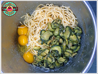 Meanwhile, beat the eggs in a bowl, add the spaghetti, salt, a pinch of pepper, the grated cheese, and finally, the cooked zucchini.