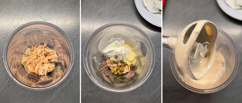 Put the drained tuna, anchovies, mayonnaise, Greek yogurt, and finally, the capers into the blender cup.