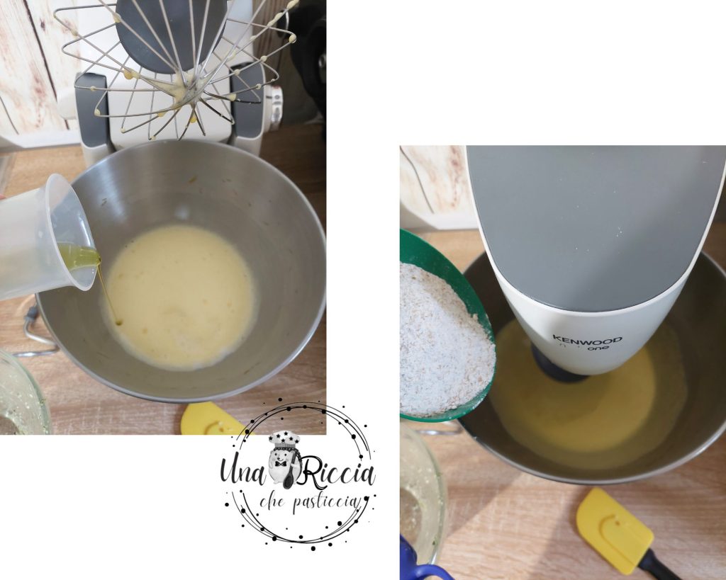 • In the mixer’s bowl, add to the eggs the liquids, then the apple juice and olive oil, blend, and then add the whole wheat flour, the baking powder, and honey, and mix again.