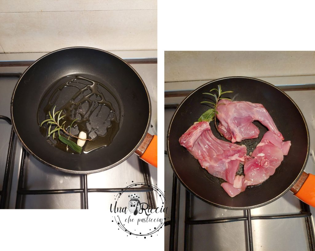 • In a non-stick pan or saucepan, place a peeled garlic clove, a sprig of rosemary, sage leaves, and a generous drizzle of olive oil and let it heat. Then add the rabbit pieces and let them brown over high heat.