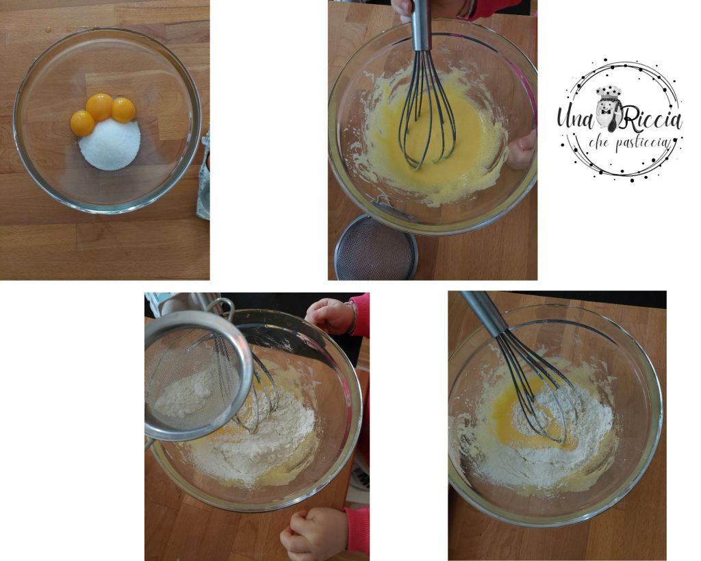 Meanwhile, place the yolks and sugar in a bowl and whisk until you obtain a smooth cream. Then add the sifted flour and starch, continuing to mix well to combine the ingredients. Now pour the warm milk over the mixture and stir vigorously.