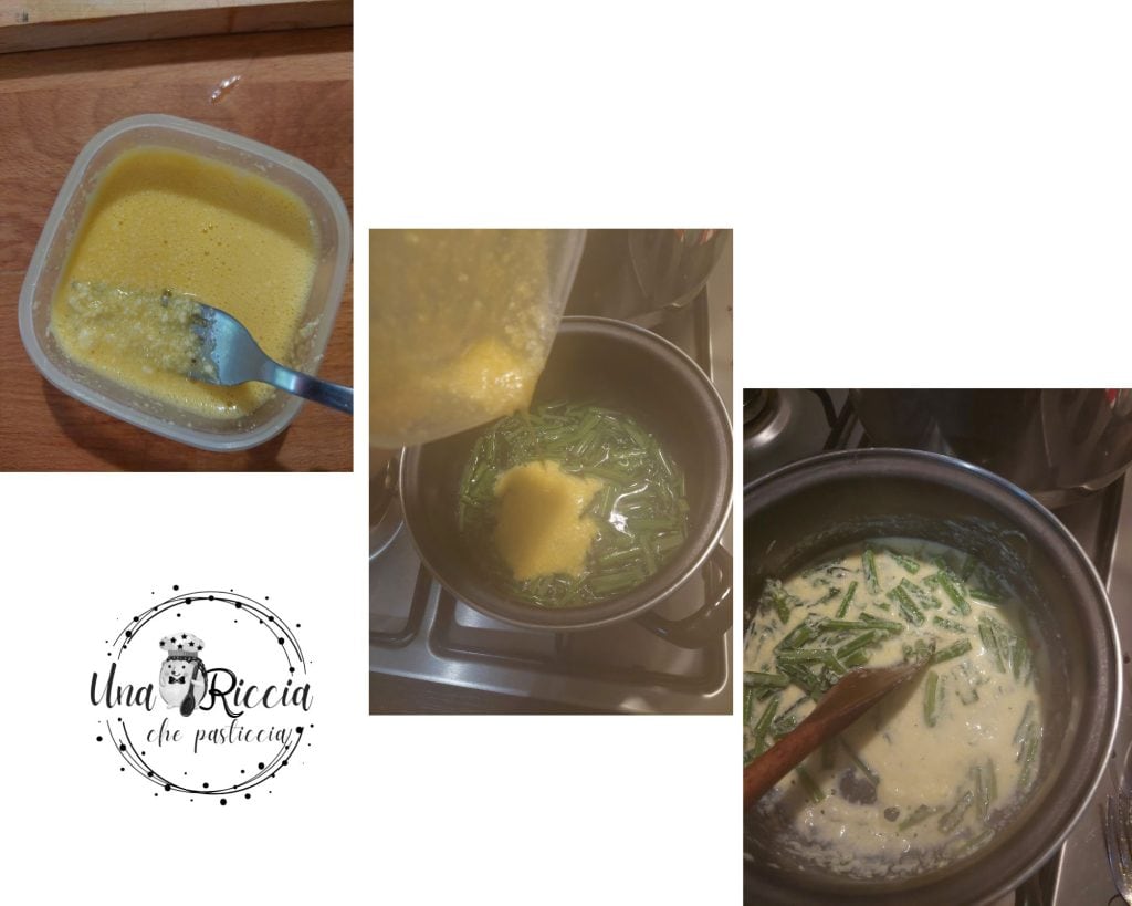 In a small bowl, beat the eggs and add the grated parmesan, mix to obtain a semi-liquid granular mixture. When the broth with the stalks starts boiling again, pour the egg scramble into the casserole and stir while keeping the heat low. Adjust salt and pepper to taste.