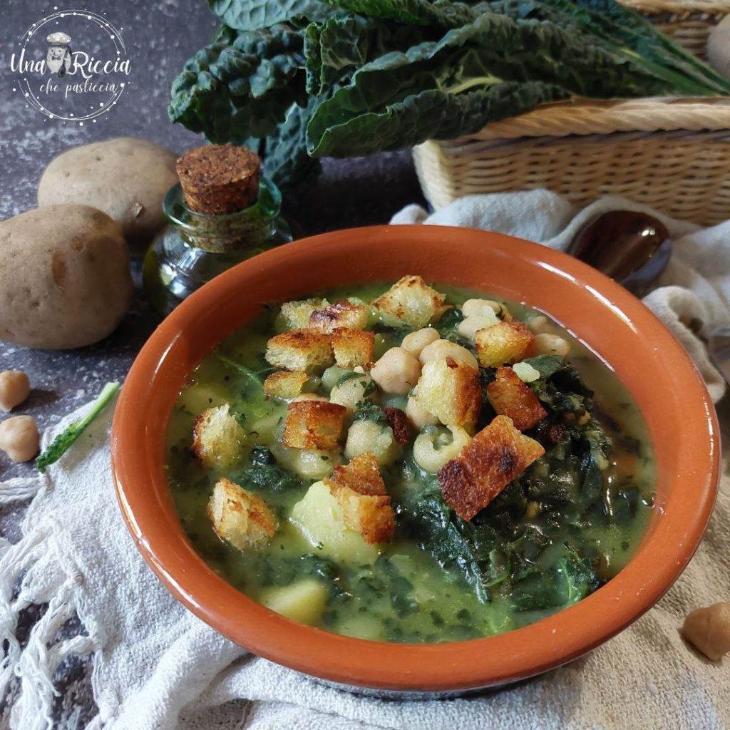 A quick and easy preparation for those cold evenings when you don’t feel like doing much. It doesn’t require extensive preparations, but you will get a tasty and flavorful dish that will make your guests happy. Today’s soup is with black kale, chickpeas, and potatoes, plus some golden croutons that add a nice crunch. Black kale is a vegetable with dark green leaves and a slightly bitter taste that, in this soup, is balanced by the presence of chickpeas and potatoes. Black kale is also great for making an excellent pesto, and with the stems, a delicious soup.