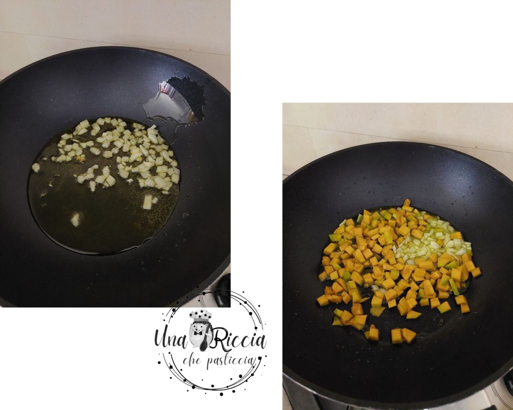 • In a high-edged pan or wok, place the oil and finely chopped onion and let it sauté slightly, then add the pumpkin cut into small cubes, lightly salt and pepper, and let it cook until it becomes soft. If necessary, add a ladle of pasta cooking water.