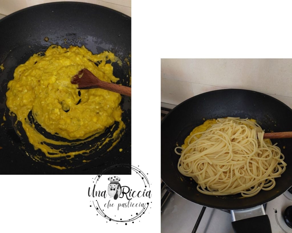 • When the pumpkin is cooked, mash some of the pumpkin with a fork (you can blend it with an immersion blender if you wish), then add the crescenza with the heat off and mix, adding a little pasta water to obtain the cream. Drain the pasta very al dente into the pan with the sauce and let it cook for a couple more minutes, adding a little water if it seems not creamy enough.