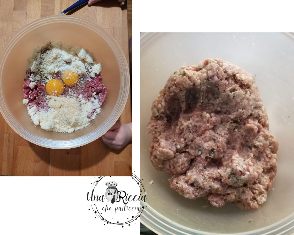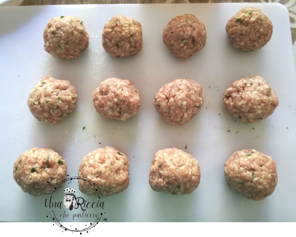 Form the meatballs by taking a portion of the meat mixture of about 40/50 grams (about 1.4 to 1.8 oz), compact it a little with your hands, then form a ball by rolling it between your palms. Place the formed meatballs on a plate and continue until all the mixture is used. You can now proceed in two ways.