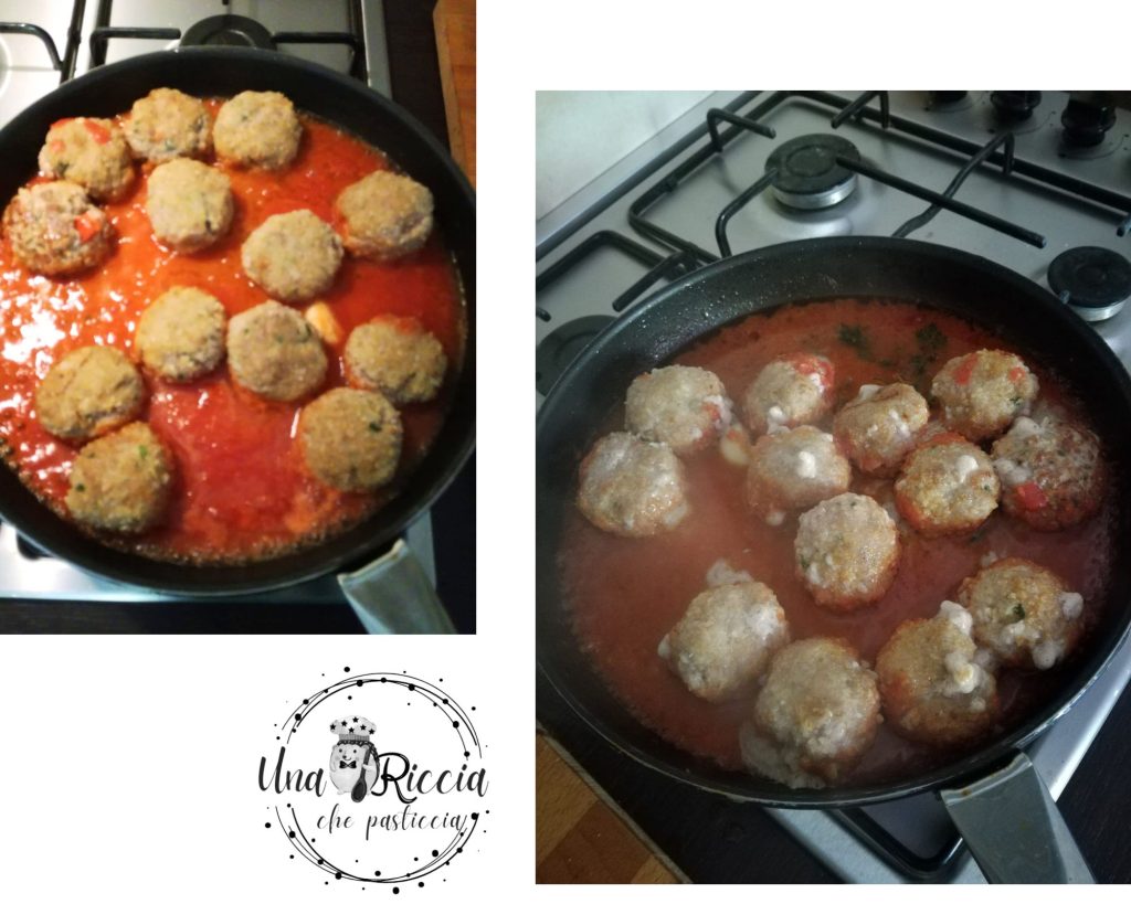 In the same pan, pour the tomato sauce and a few leaves of parsley, add salt, and let cook for a couple of minutes. Then, return the meatballs to the sauce and let them cook for 15/20 minutes over low heat with a lid. If necessary, because the sauce thickens too much, add half a glass of hot water.