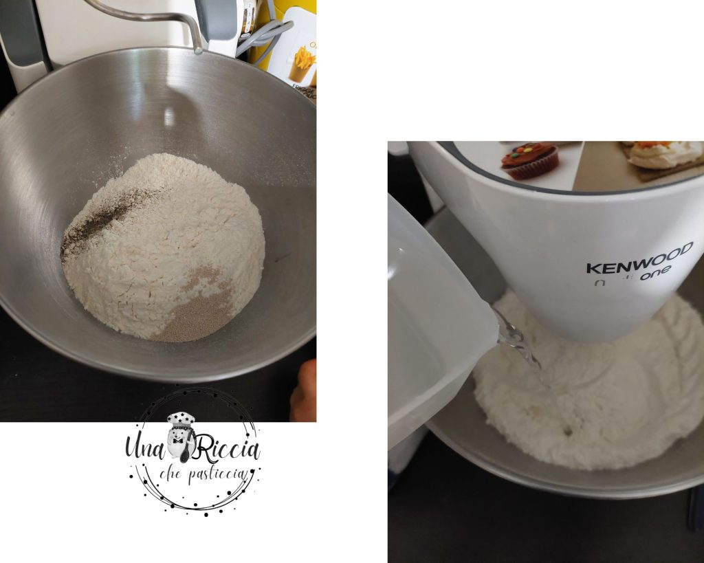 In the bowl of the stand mixer, pour the flours, the instant dry yeast, and the ground pepper and start mixing with the hook. In a small bowl, add the water with the salt and let it dissolve, then pour it slowly into the flour.