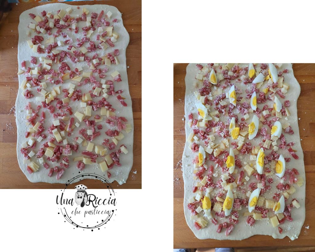 Spread the cubes of cold cuts and cheeses on the dough, spreading them well to cover the entire surface, then add the hard-boiled eggs and sprinkle again with the grated Parmesan.