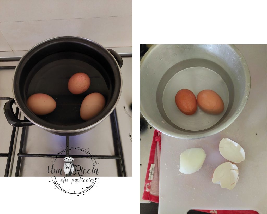 Meanwhile, prepare the filling, including the hard-boiled eggs, cold cuts, and cheeses. In a saucepan, place some water with the eggs and let them cook for 7 minutes from the boiling point, then drain them in cold water and peel them.
