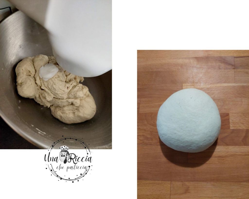 At this point, start adding the lard, one small piece at a time, ensuring that the previous piece is well absorbed before adding a new one. Once all the lard is incorporated, let the machine work a little longer until the dough is well bound and wrapped around the hook, then turn it out onto a work surface, shape it into a ball, and place it in a lightly oiled bowl to rise. Cover with plastic wrap and let rise for 3 to 4 hours or until doubled in size.