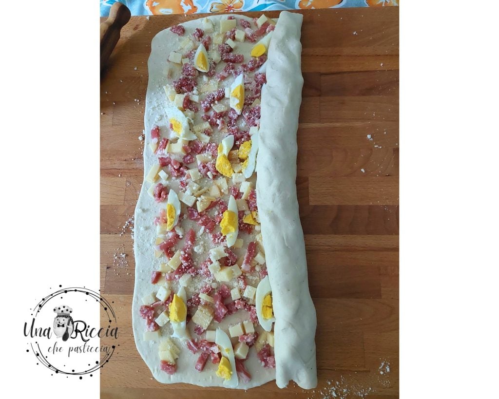 Starting from the long side, roll the dough onto itself, squeezing it slightly as you roll and being careful not to let the filling escape. Once you have a sausage shape, place the seam side down.