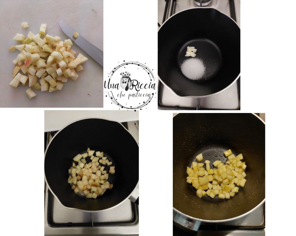 • Meanwhile, the panna cotta thickens, let’s take care of the filling decoration. Take the apples, peel (I left a little) and core them and then cut them into small cubes. In a pan put the butter with the sugar and let melt then add the diced apples and cook for 5 minutes over low heat.