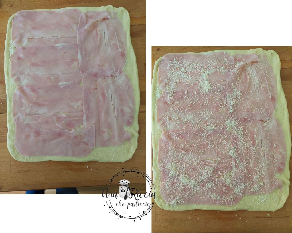• Place the ham slices over the grated cheese, trying to cover the entire surface, then sprinkle again with the remaining parmesan. The filling should be well arranged to cover every part, leaving the long edges free to seal it at the end.