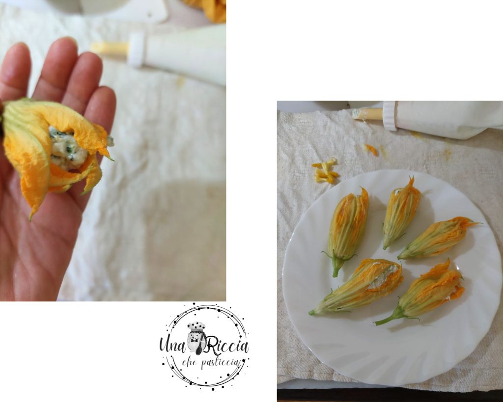 Take one flower at a time and fill it with the ricotta using the piping bag, trying not to overfill. Place the stuffed flowers on a plate or work surface and continue until all ingredients are used.