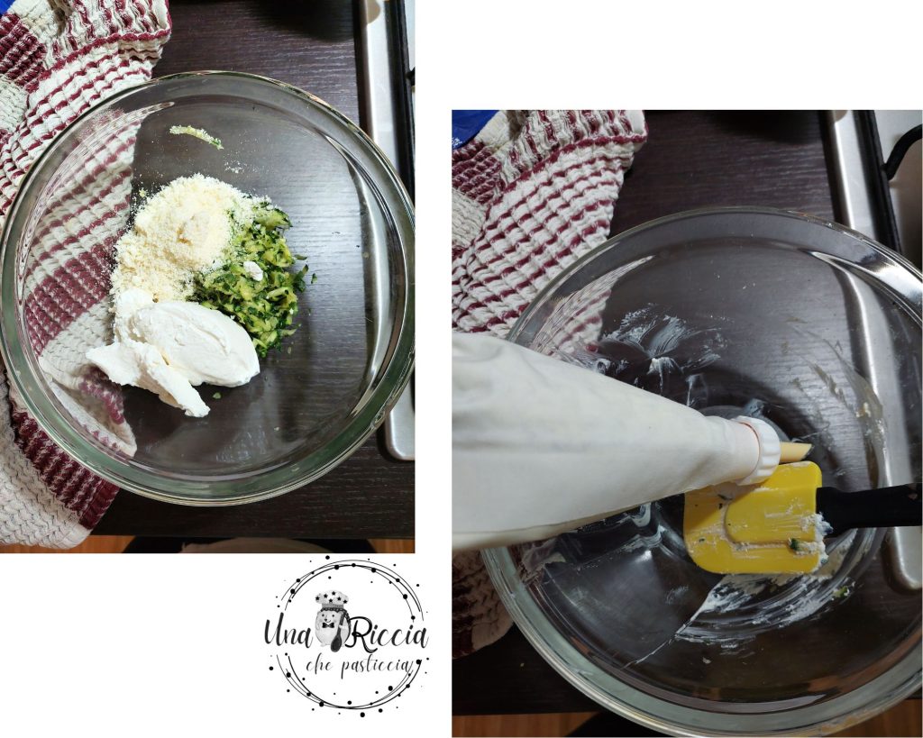 In a bowl, place the drained ricotta, grated cheeses, finely chopped parsley, salt, a dash of pepper, and squeezed zucchini. Mix with a spatula and then insert the mixture into a piping bag with a long nozzle.