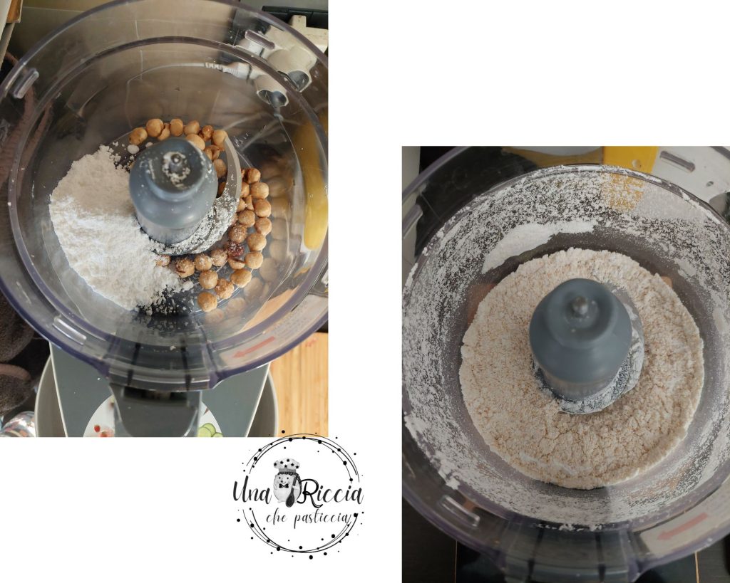 Put the flour and cold diced butter in the mixer and turn it on to sand and obtain a crumbly mixture, then add the egg, a pinch of salt, and the hazelnut flour, turn on the mixer again and let it go until the dough compacts.
