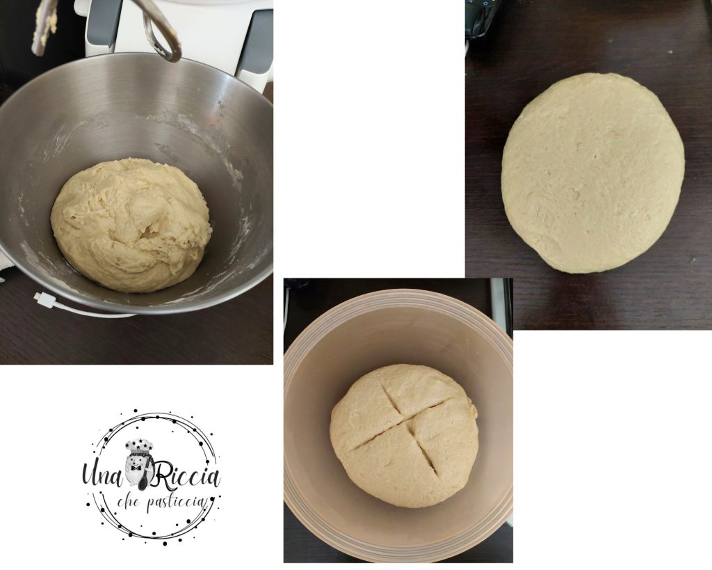 Continue kneading until the dough is well combined, smooth, and soft. Then, turn it onto a work surface, knead for a minute with your hands to form a ball, place it in a bowl, make a cross on top, cover with plastic wrap, and let rise for a couple of hours until doubled.