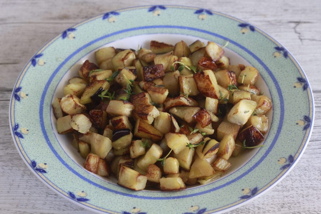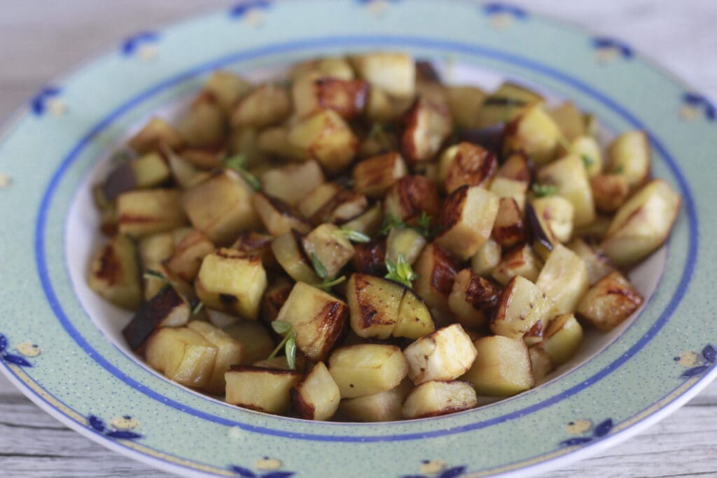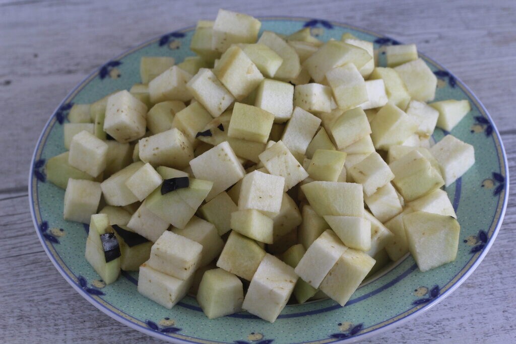 Peel and cube the eggplants