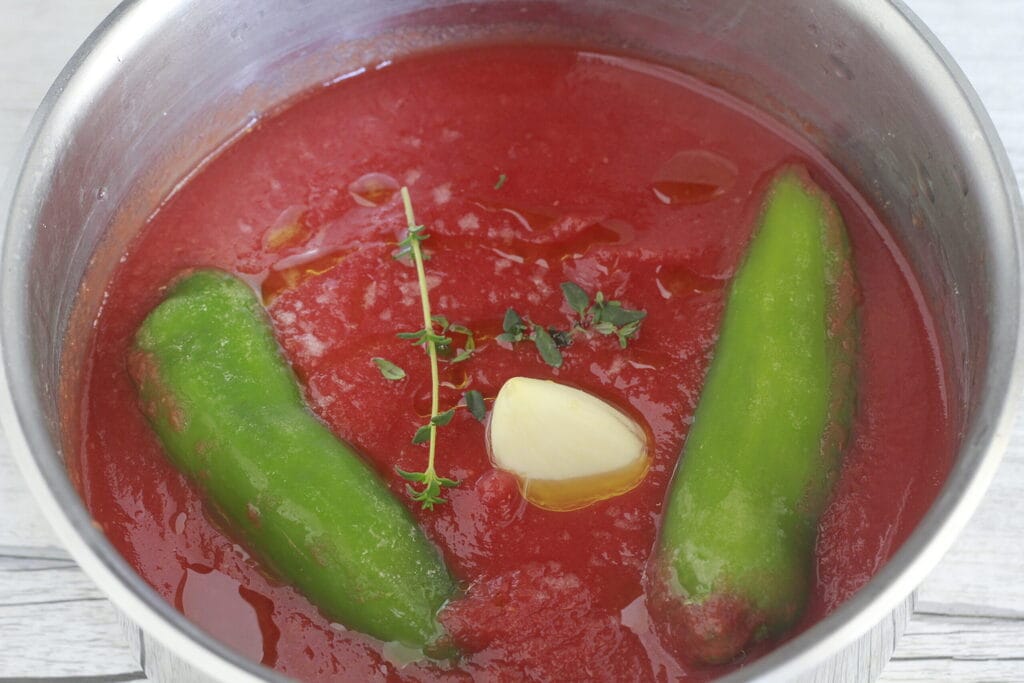 Then prepare a simple sauce by putting everything together: tomato, thyme, garlic, salt, extra virgin olive oil, and two whole friggitelli peppers. Let it cook over medium heat for 30 minutes.