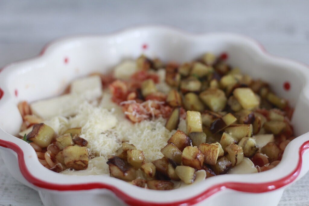 Combine the eggplants with the tomatoes. Cook the pasta al dente, drain it, and dress it with the ready tomato sauce. Place half of it in an oven baking dish, add all the eggplants, and half of the fiordilatte and Parmesan cheese.