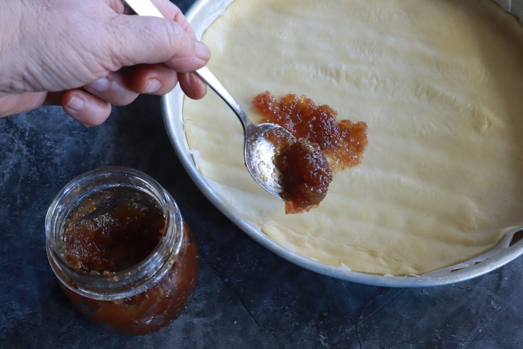 I spread my homemade lemon jam on the rolled-out shortcrust pastry and