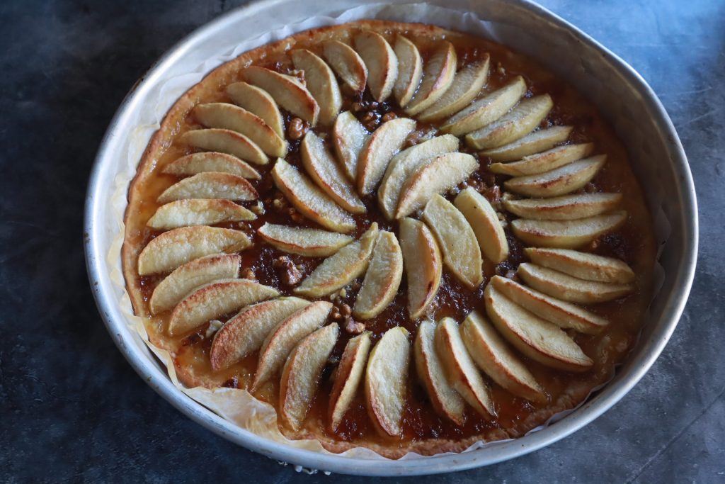 I wanted to try the vegan round rolled-out shortcrust pastry, a breakthrough for preparing a dessert quickly. I used the lemon jam I had made earlier and the Golden apples.