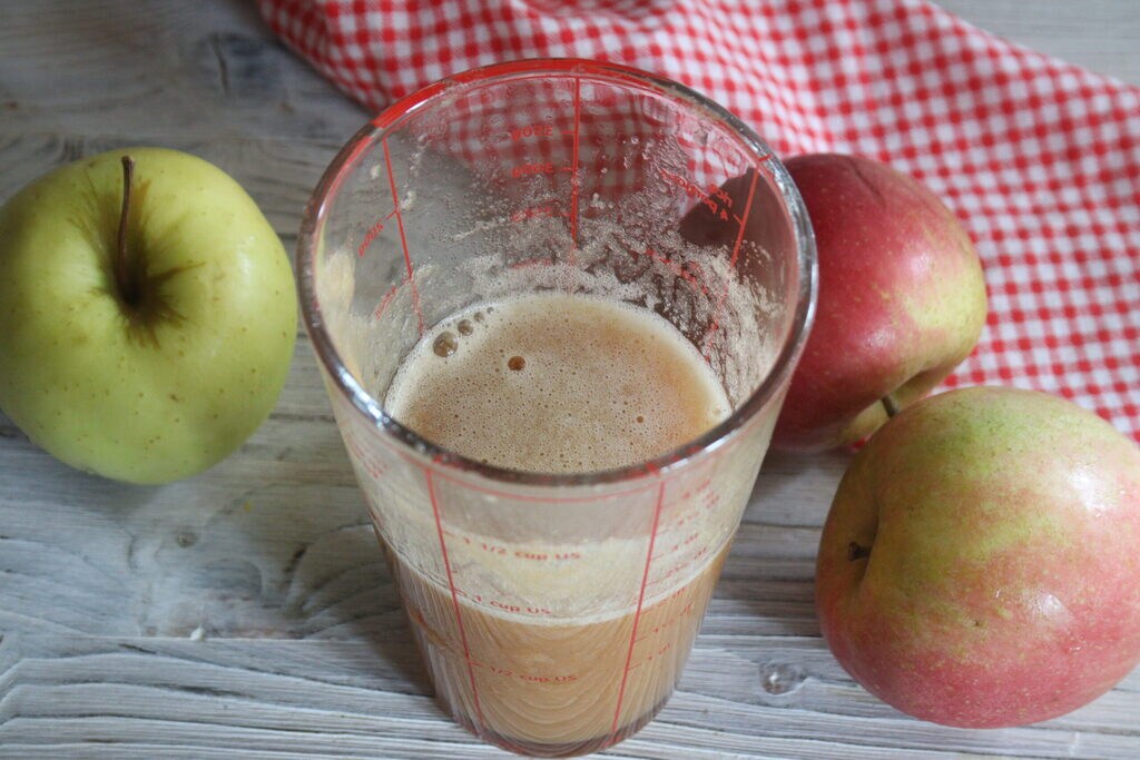 • and with the juicer I extract the juice, of course you can also use store-bought apple juice if you prefer.