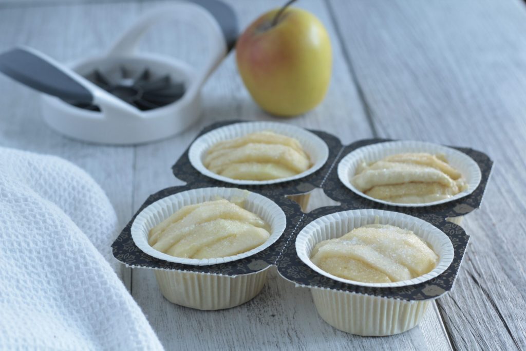 Arrange the sliced apples in a spiral pattern on top of the cake and sprinkle with a tablespoon of sugar. Of course, you can also make mini apple pies.