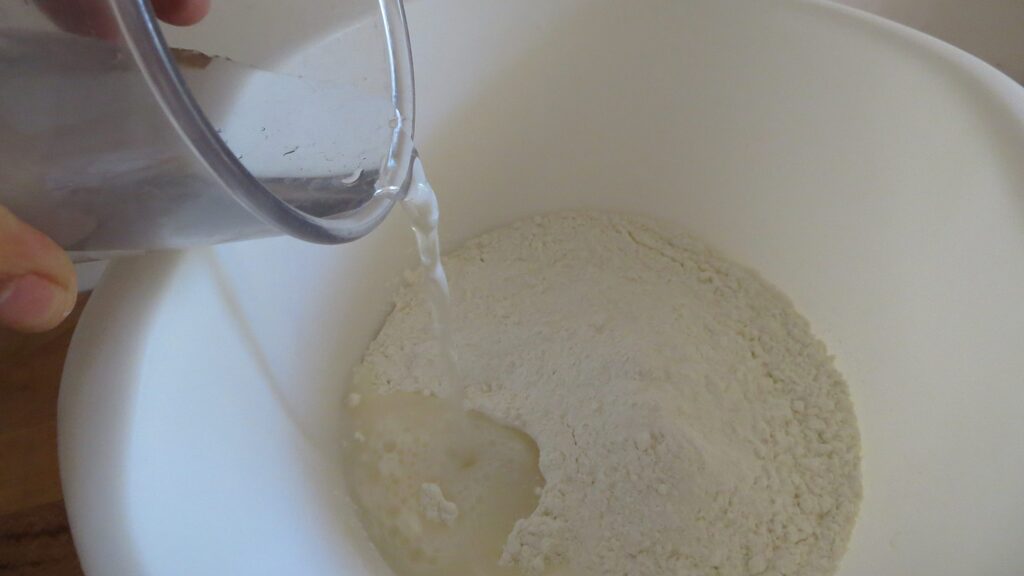 Add the extra virgin olive oil, water, and salt, start hydrating the focaccia gently at intervals until the emulsion is used up.