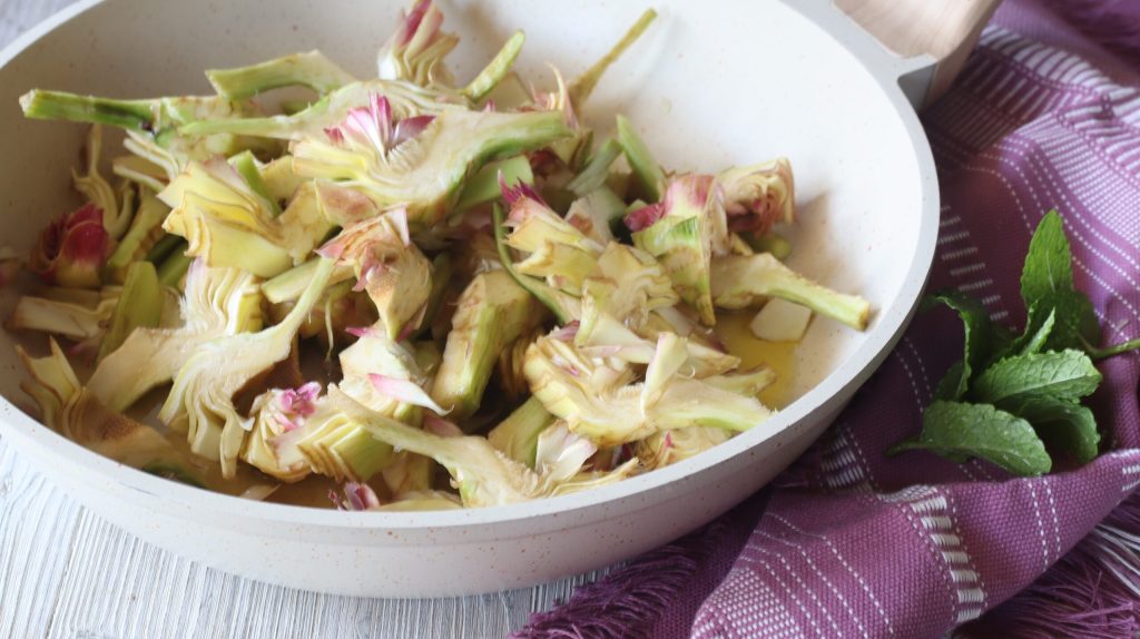 In a pan with extra virgin olive oil, lightly brown the garlic, add the drained artichokes and cook with the lid on for 15 minutes, stirring often.