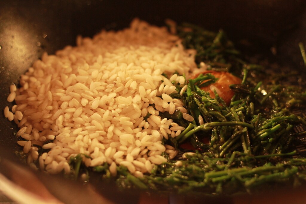 Sauté a small piece of finely chopped onion with two tablespoons of extra virgin olive oil, add the asparagus cut into small pieces, and immediately after the rice, toast it and pour in the white wine. Start adding the vegetable broth little by little until fully cooked, it will take no more than 16 minutes.