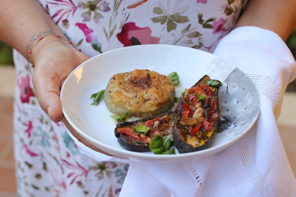 Baked eggplant and onions, of course gratinated, with sweet and tender Giarratana onions. Just a few more days and then after the festival, even the Giarratana onions finish their production cycle, and you have to wait until next year to enjoy them again. Today, along with the baked onions, I also added eggplant, a seasonal fruit, of course, just cut in half and seasoned with always in-season aromas like oregano, for example, and fresh basil, which should never be missing in the kitchen.