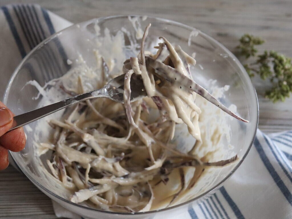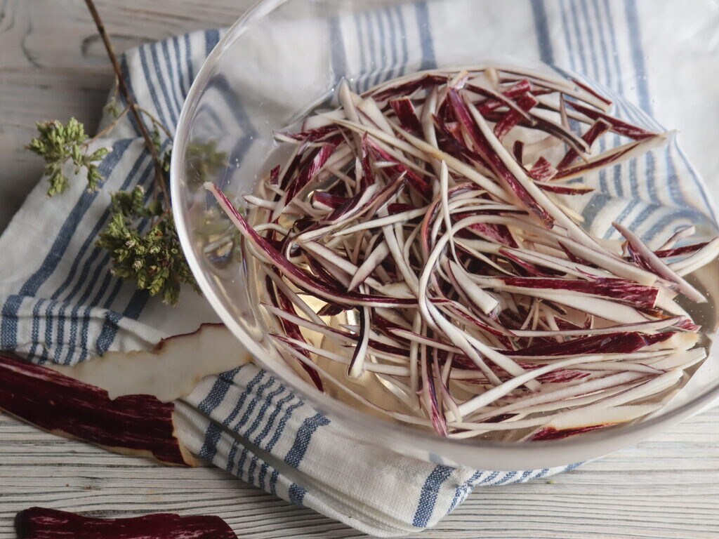 Peel the eggplants using the peeler to make them very thin and cut into julienne strips. Place them in cold water to remove bitterness for at least 2 hours. After this time, dry them and prepare the batter.
