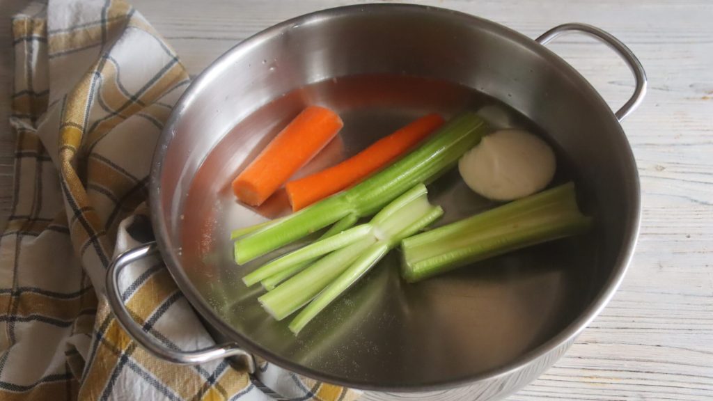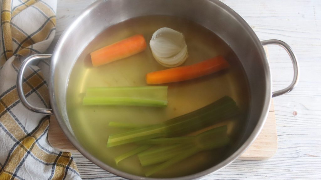 I prepare the broth right away before starting the kale soup, at least 30 minutes in advance, with carrots, onion, and celery that I will chop at the end of cooking to add to the soup.