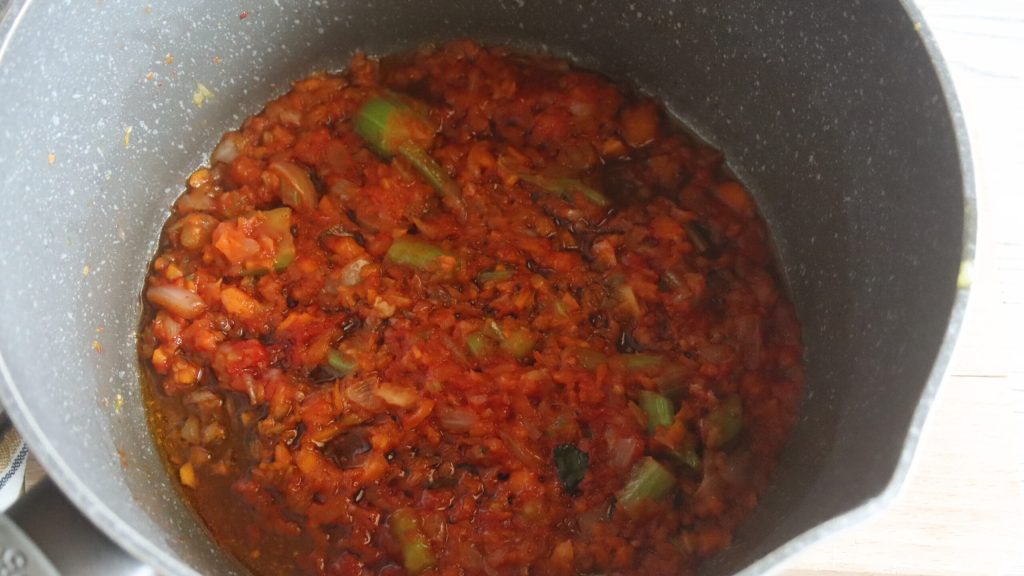 Chop the celery, carrot, and onion and, together with the garlic, EVO oil, and a pinch of chili pepper, brown in the pan for a few minutes.