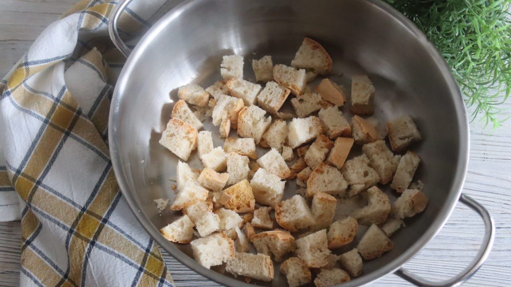 I sliced and then cubed the unsalted bread, put it in the pan with sprigs of rosemary and 2 tablespoons of EVO oil, until they are golden on all sides.