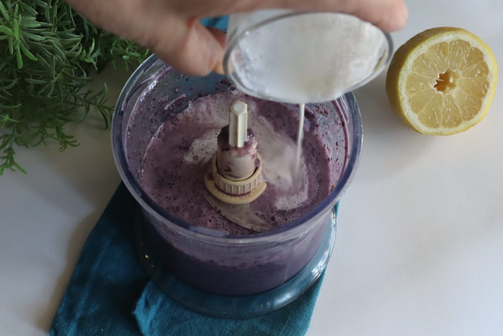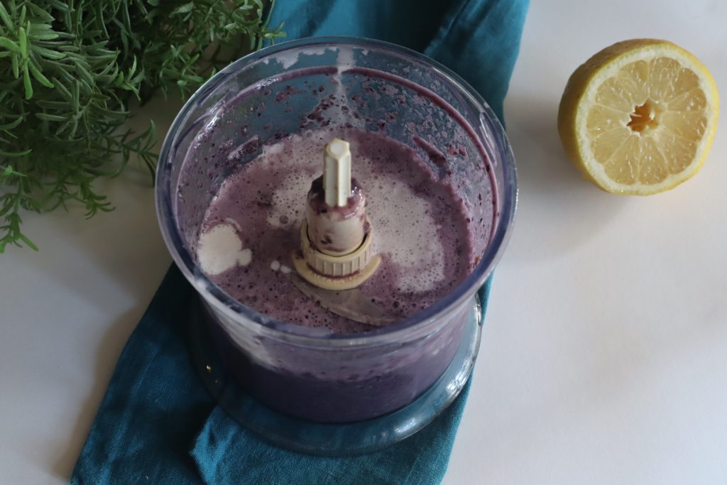 Use a blender or a chopper, like the one I used, to mix the ingredients. Put the black mulberries in the chopper still frozen. Pour the lemon juice over them.
