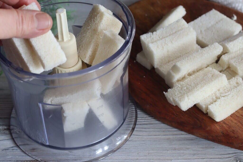 I cut into small pieces 3 slices of white bread without crust. You can also simply use 3 slices of sandwich bread, removing the dark crust.