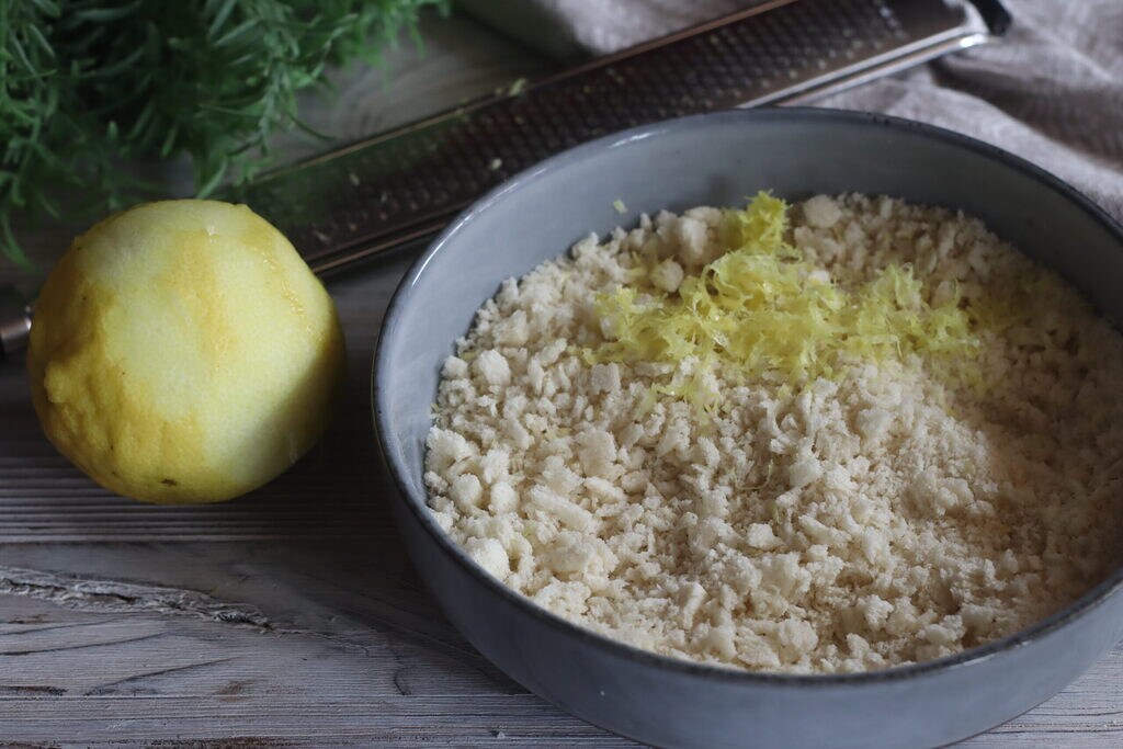 Season the panko with grated lemon, chopped parsley, and garlic.